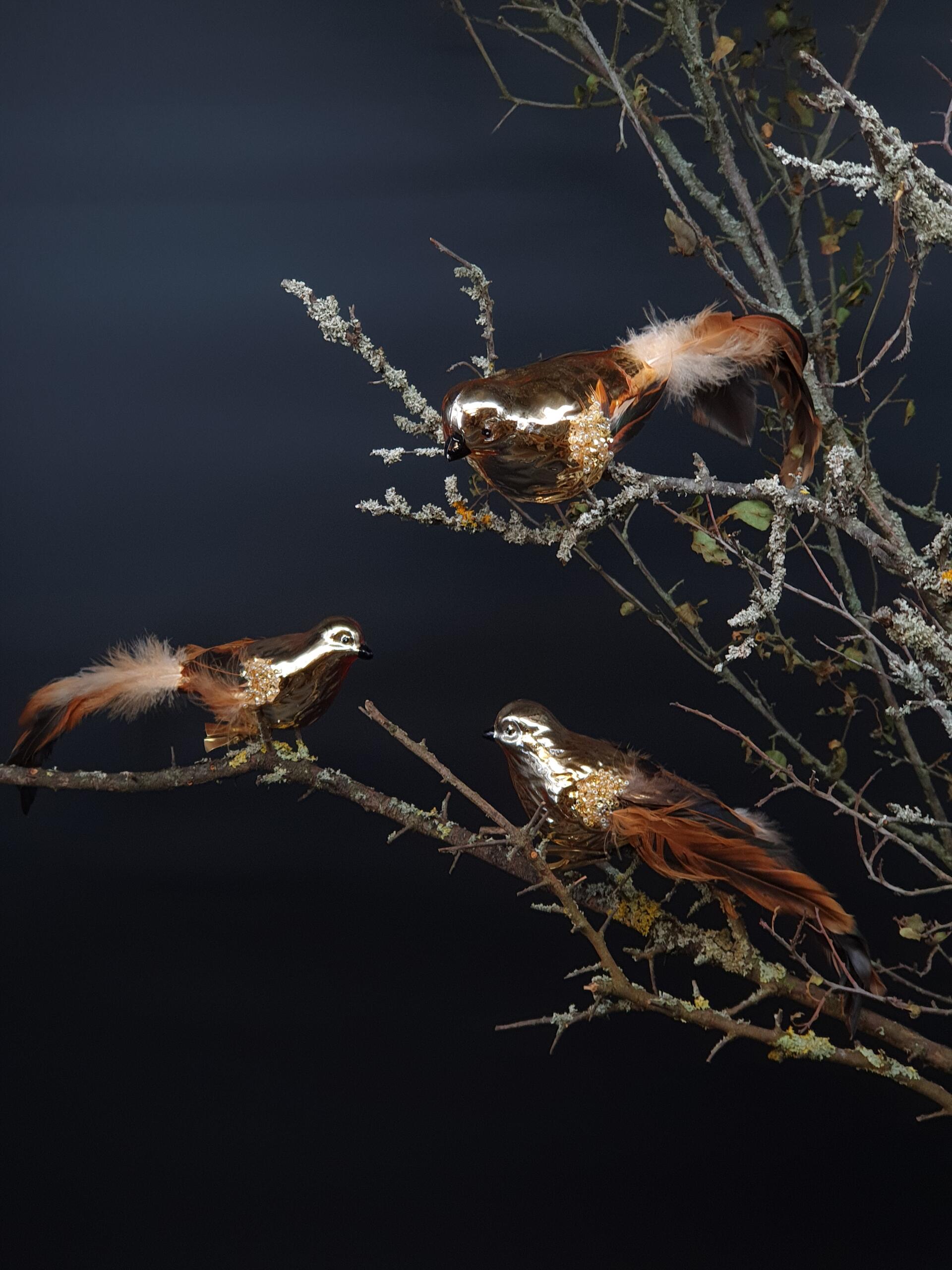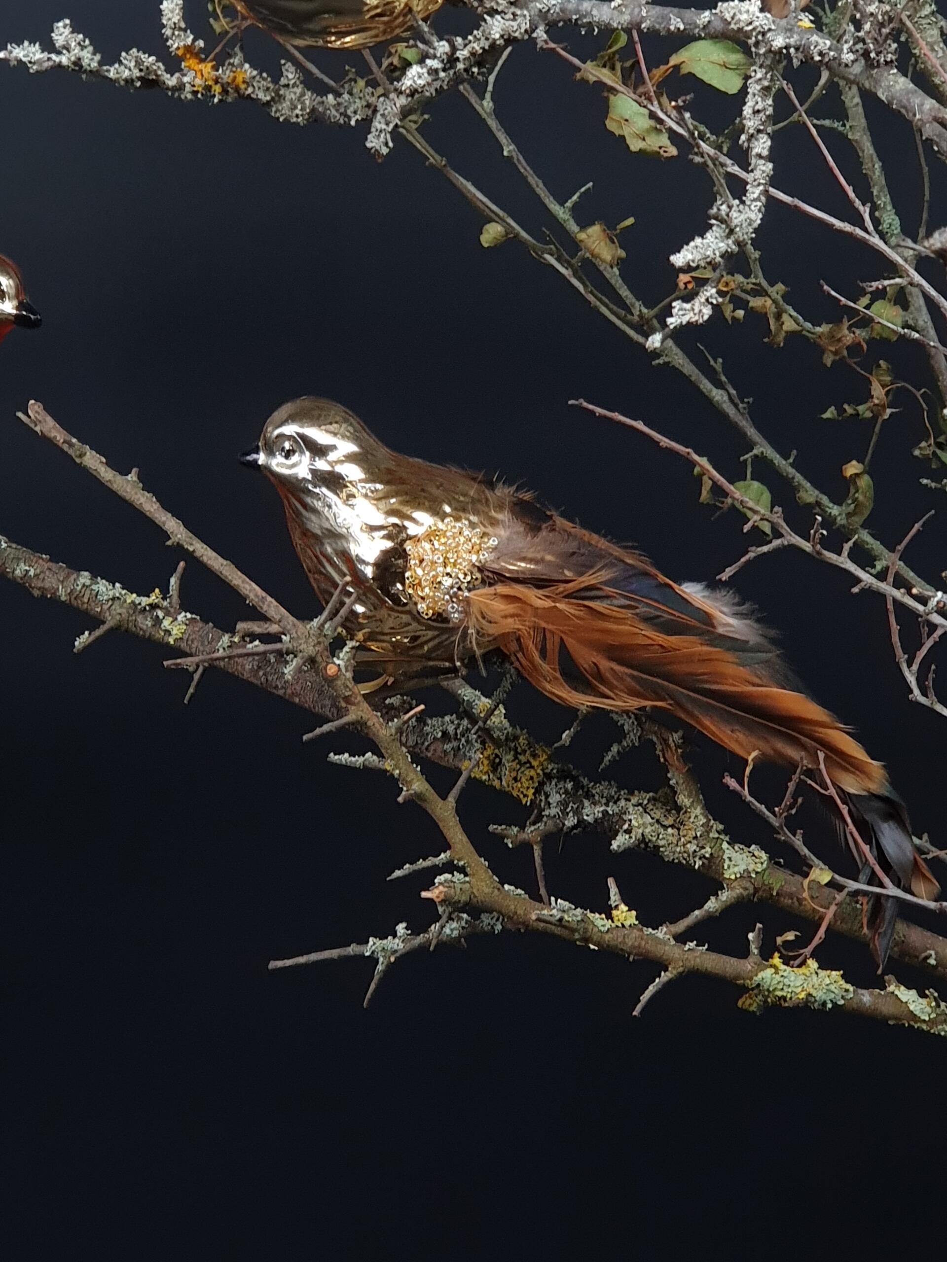 Verleihen Sie Ihrem Weihnachtsbaum einen Hauch von Eleganz mit unserem bezaubernden Christbaumschmuck in Form eines glänzenden Glavogels. Dieser handgefertigte Schmuck aus hochwertigem Glas ist mit einer zarten Vergoldung versehen und zeigt exquisite authentische Details, die mit liebevoll platzierten Federn akzentuiert werden.