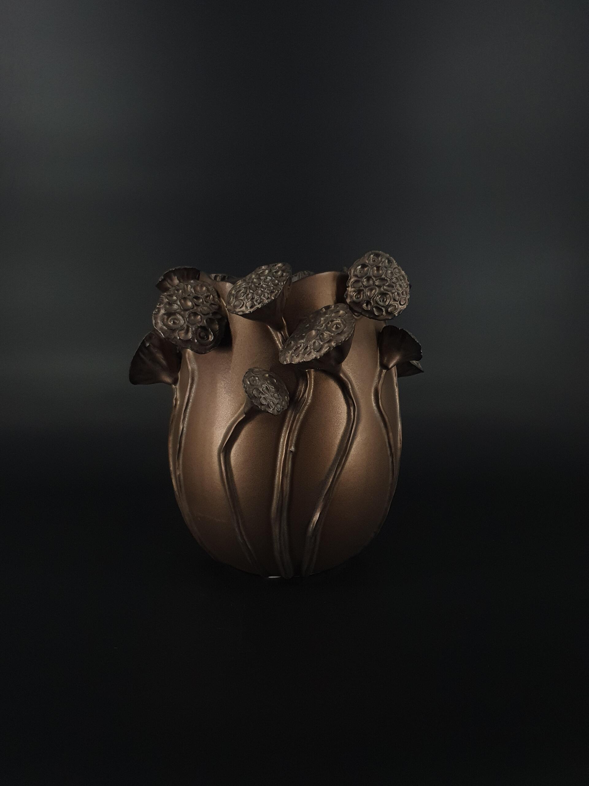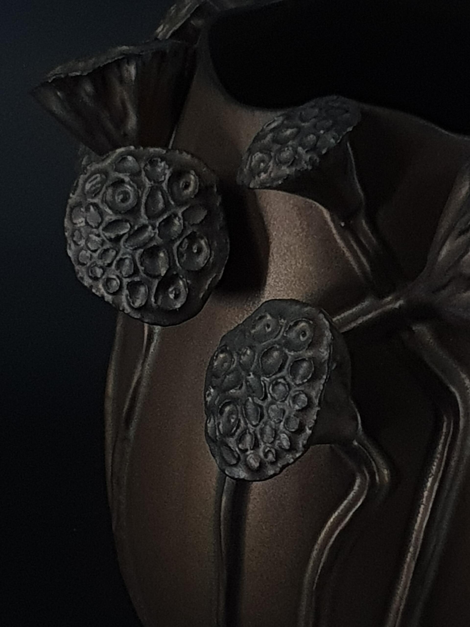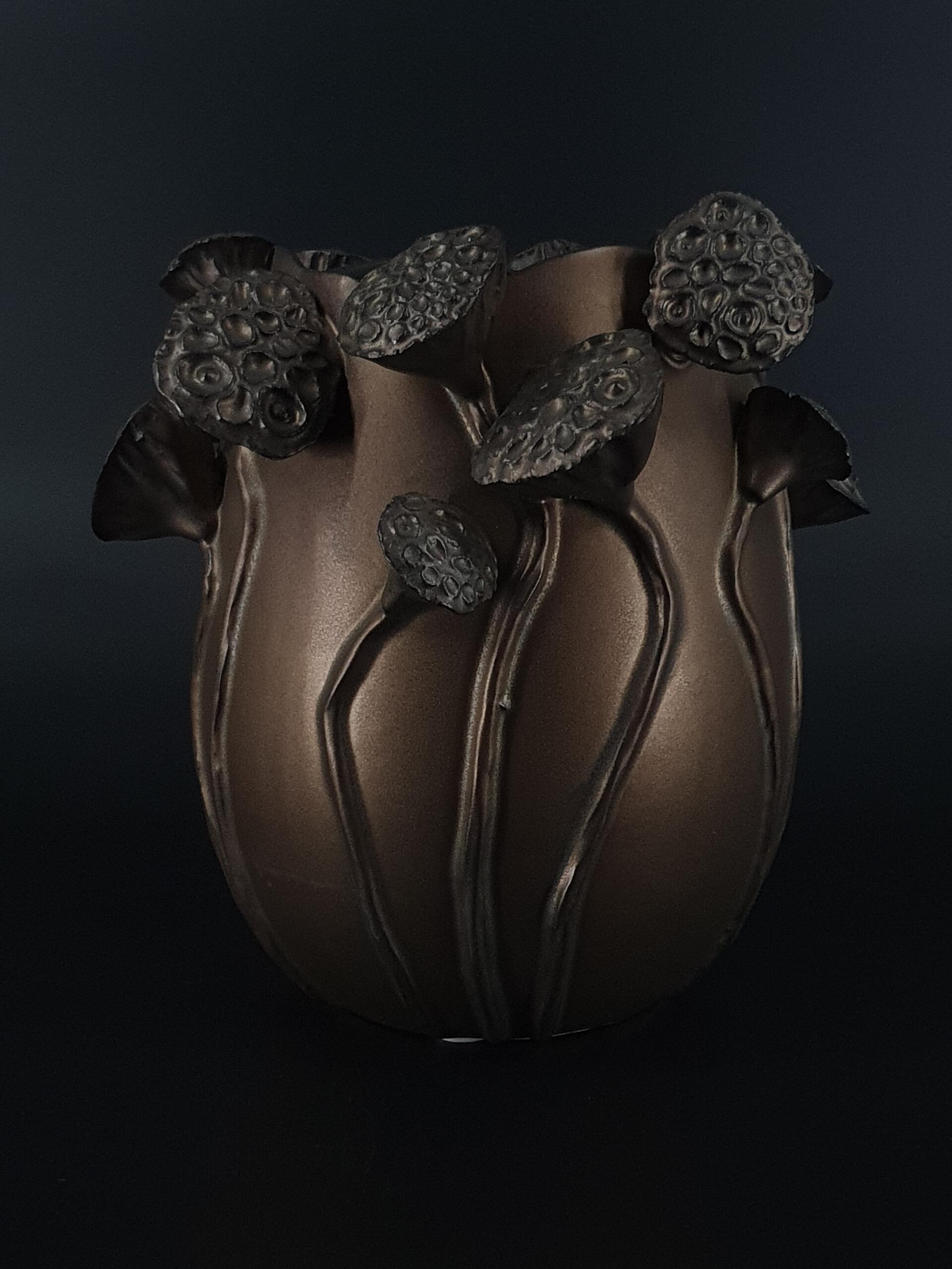 Diese Vase vereint zeitloses Design mit feiner Handwerkskunst. Die Keramik besticht durch eine elegante Bronze-Lasur, die im Tageslicht sanft schimmert und jedem Raum eine warme, luxuriöse Note verleiht. Die filigran gearbeiteten Lotuskapseln am Rand verleihen der Vase eine besondere Textur und einen Hauch von Naturinspiration.